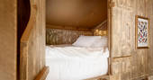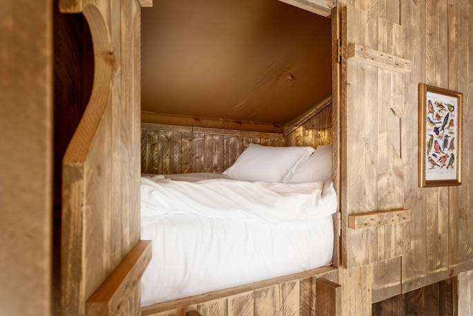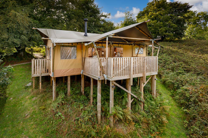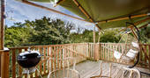 Ebron’s raised deck looks out over the stream in this quiet valley, a hidden fold of Cornwall’s countryside just a few miles from the coast. The space is a lovely blend of wilderness and comfort, with a cool cabin bed, gas hobs and an en suite, modern bathroom, but a BBQ outside and walls that fold back to let nature right in.