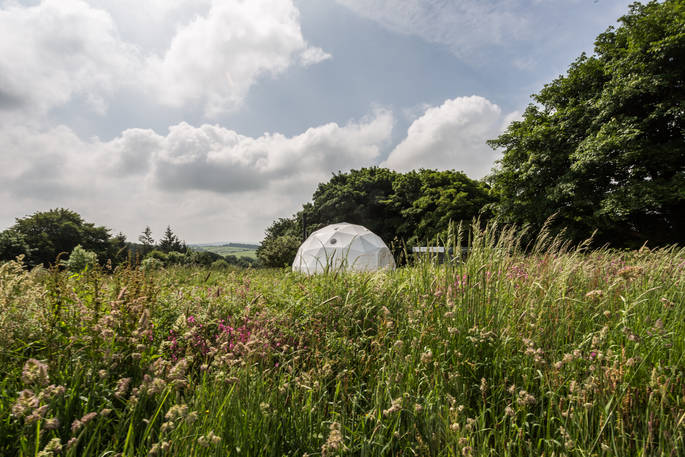 The stylish surroundings of Eyl let you enjoy the wilderness of Bodmin in style and comfort. You can laze in the super king-size bed and watch birds dart among the wildflowers through the huge window or enjoy silent starlit skies thanks to the off-grid dome’s lack of light pollution.