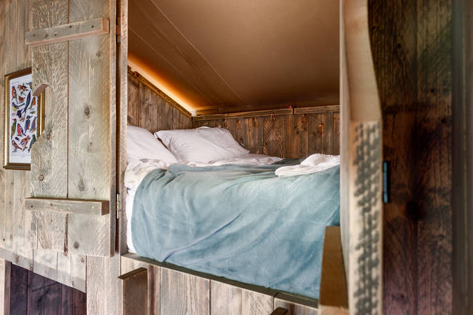 Meals made from Cornwall’s legendary local produce can be whipped up on the gas range, and eaten at the huge wooden dining table indoors or outside, before you gather in the warmth of the wood-burner for board games and cards. Or head to the on-site honesty shop for treats. Kemper’s off grid, with solar lighting and gas power for the water.