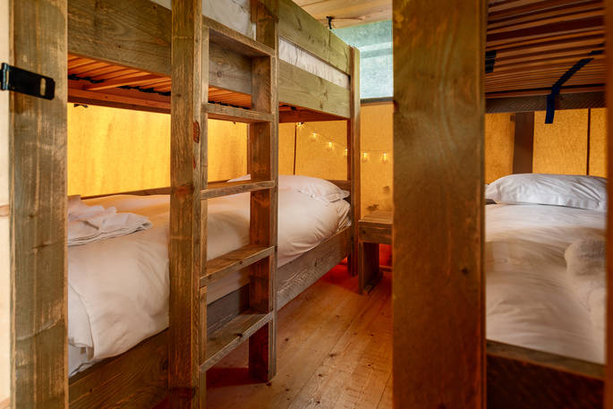 Myself and 7 others stayed at Kemper over the weekend and had the best time! We loved the little treat box we were given, the tent was so clean and well stocked up. We all loved the outside space and the campsite itself was beautiful. Hearing the stream all the time was lovely and there were so many bird noises we all enjoyed listening to that instead of music most nights! The beds were all comfy (even the bunk beds). The bathroom was stocked with shampoo and hand wash which helped those who forgot things. All of us loved the egg chair and outside furniture as well.