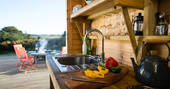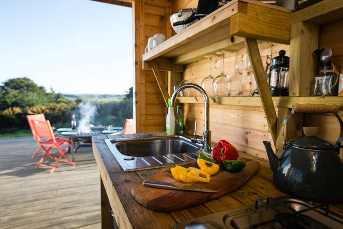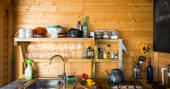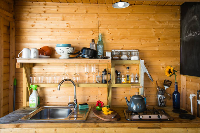 - Gas hob and cool box in timber kitchen behind geodome
