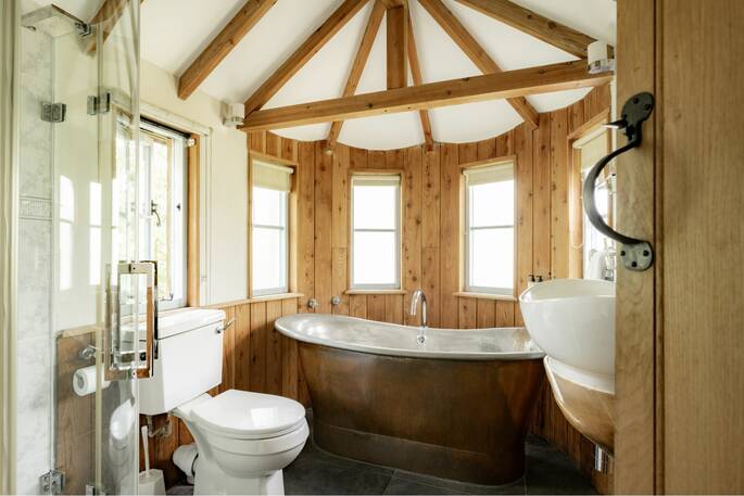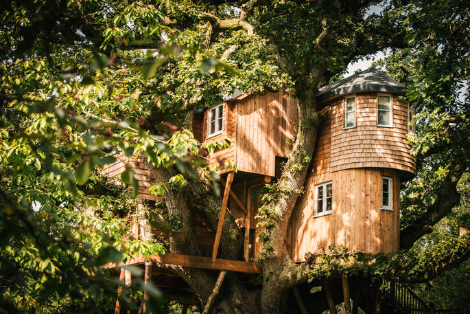 The steps up to Treetops Treehouse lift you clear into the canopy and you’re suddenly alone with the peaceful breeze through the leaves, the occasional skittering squirrel and only the good kind of twitter. The temptation is to fire up the wood-burner, settle on the sofa and crack into the local welcome cider, but the rest of the treehouse is worth exploring. Upstairs you’ll find the king-size bed and in another room downstairs the huge copper bath, where you can lie back and soak up the quiet as the stress just drains away. The kitchen has everything you need to cook and there’s a barbecue outside on the deck, but if you fancy a treat then book in at the superb restaurant of The Fox & Hounds and head across the grounds for dinner. When you come back, sink into the bean bags in the secret cubby hole on the deck and watch the sun set on the fishing lake and the trees of Heywood Forest as the local train chugs past beneath you.