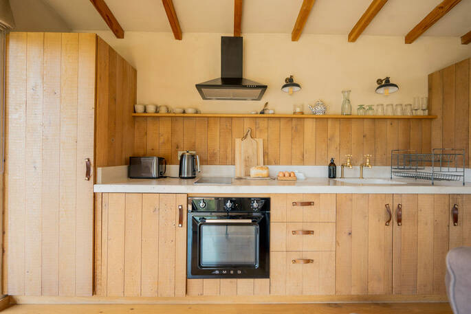 - Kitchen equipped with an oven, two induction hobs, kettle, and toaster
