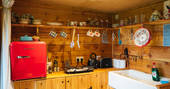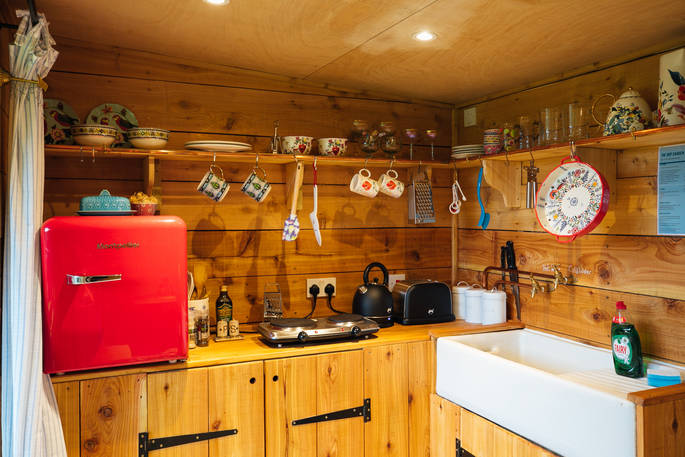 - Kitchen equipped with electric hob, kettle, fridge, Belfast sink with hot and cold water