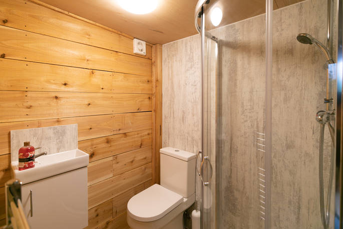 - Private and compact bathroom inside the cabin with a hot shower, flushing toilet and basin