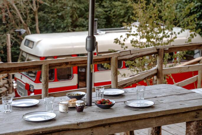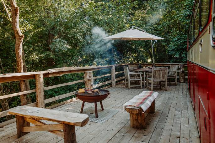 Brilliant space! We, family of four with younger kids, loved the bus, with the kids always behind the wheel. The site is under a canopy of trees which was perfect as it was very hot when we were stayimg. There are two seating areas, one next to the bus and a second on the hill next to the kitchen, as well as a fire pit area at the top of the small hill. The kitchen area and shower is great though the lack of an electric cooler was a slight issue due to the heat but the very friendly owners dropped off extra ice packs for us to keep things cool. The area is beautiful with a small brook running past the bus and a beautiful walk out the back of the site a must. Can’t wait to come back.