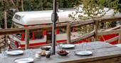 Drive up the lane to the site, looking out onto beautiful views of forests and hills, and you’ll start to feel a sense of calm and contentment that only increases once you arrive. This spacious, peaceful encampment is completely off grid, with its own solar power, spring water and composting toilet. A converted bus dating from 1976 sleeps two adults and two children (there’s a yurt nearby that can be booked for extra guests) and is thoughtfully kitted out with a small stove and kettle for your morning cuppa and a wood burner to keep things cosy. The deck behind overlooks a stream and is furnished with bench seating and a firepit: as the farm is in a Dark Sky Reserve, the skies on clear nights are fabulous. On an upper level is a shepherd’s hut with a kitchen (a cool box serves as a fridge, with ice packs replaced daily), a deliciously hot shower, and a dining deck with a BBQ and a large hand-crafted table to feast around.