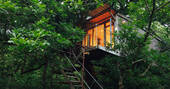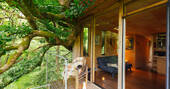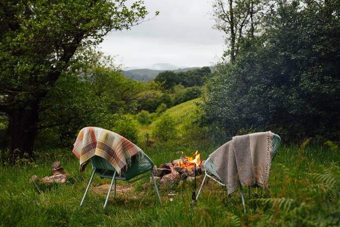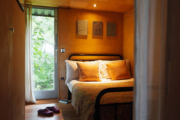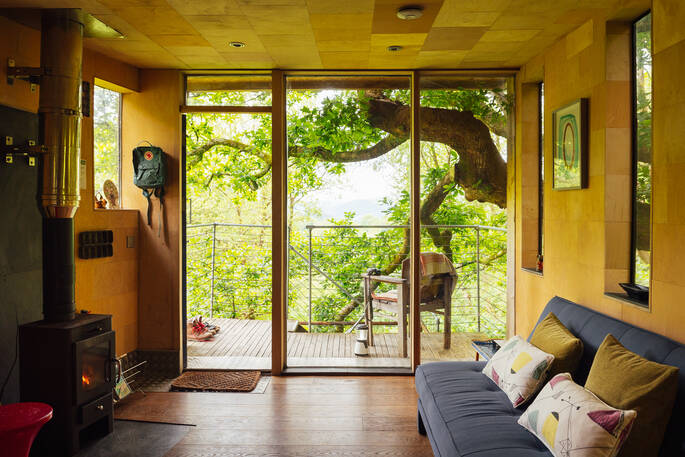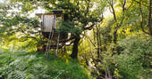 The treehouse at Beudy Banc is a simple, open space where you can sit among the trees with the stream rippling below and enjoy the peace of the Welsh countryside. There's a double bed and a wood burner by the sofa, hobs for cooking on, a modern bathroom and nothing else in the way of modern distractions. It’s a chance to ditch the wifi and unhook for a while, wandering the woods, spending awhile in the bookable sauna and plunge pool or simply sitting out on the deck looking at the stars.
