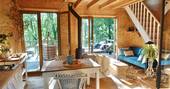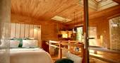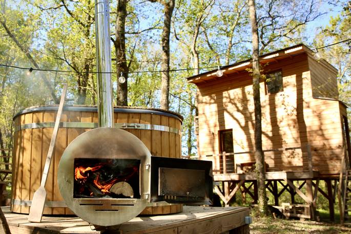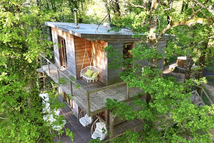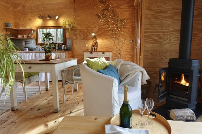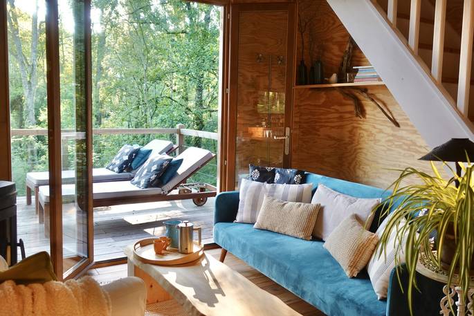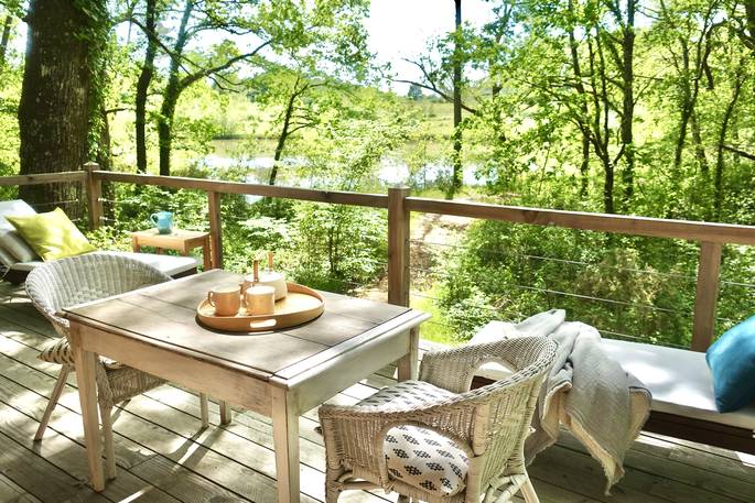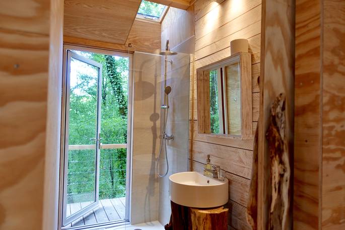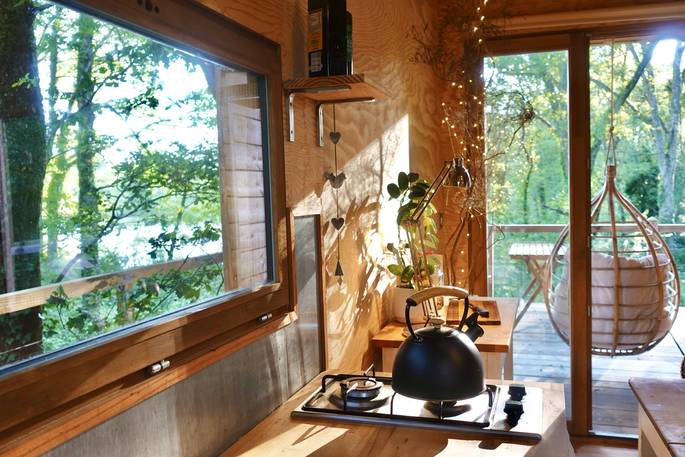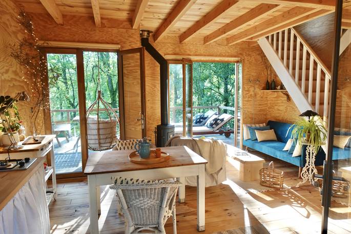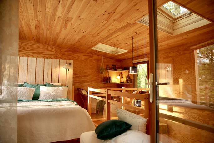 This is a beautiful piece of clean, light design that lets the woodland and lakeside surroundings and the peace of the Dordogne flow in. The treehouse overlooks the tranquil lake where guests can swim and row. Upstairs, the bedroom has its own terrace where you can throw open the doors and feel like you’re sleeping in the treetops as you stretch out in the king-size bed. Downstairs is an open-plan living room and kitchen that leads onto another deck where two basket chairs hang lined with deep cushions. Even the shower has a skylight in the roof, so you’re never cut off from nature. You’ll breeze around the space, utterly at ease, then maybe head down to the lakeside for a quick dip and an afternoon picnic and come back to light the wood burner or get the private hot tub going and soak under the starry skies.