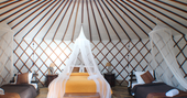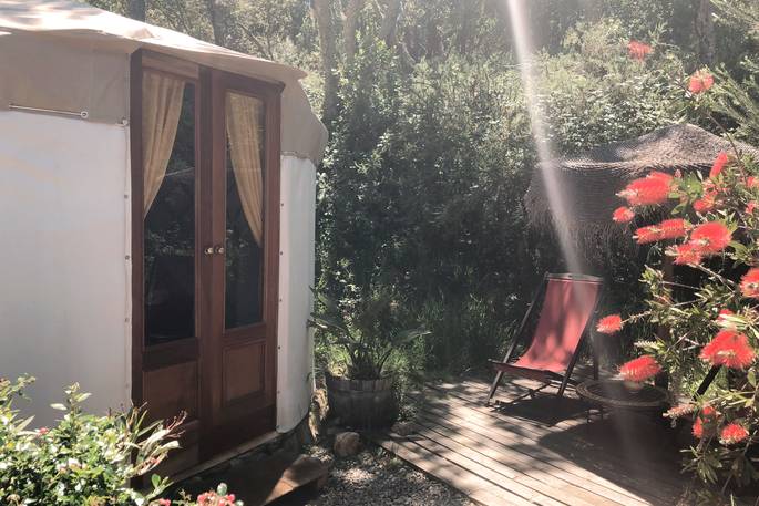 Imagination Yurt is perched atop a small mound for extra space and privacy! WiFi, plug sockets, electric lighting, double canopy bed, two wonderfully chunky singles and an ensuite bathroom tick all your camping comfort boxes. The fenced private terrace with a little bench, Moroccan lantern and views across the camp are great for sun-dazed afternoons and balmy evening aperitifs.