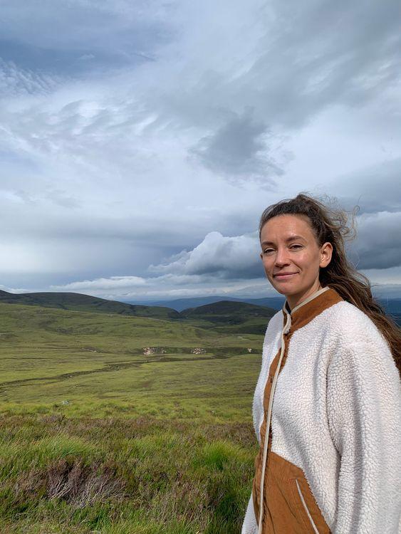 Yeah, Nan Shepherd, she's actually one of the more famous women that I've sort of been researching. And she was a writer. She was a poet. She wrote some really famous books, one of which is called The Living Mountain, and she lived in the Cairngorms, and she just walked and walked, which again, sort of 1920s to 1940 which is when she did it, was quite rare for a woman just to go off on her own into the mountains. And she wrote the most beautiful book about the Cairngorms, called The Living Mountain. And at the time, it didn't get published, because it was quite an unusual book. So it was more of a sort of philosophical text than a standard book. And at the time, all books about mountains were by men and about them conquering the mountain and getting to the top. And this book wasn't about that. It really encourages you to think of the mountain environment as a whole and not just rush to the top, you know, experience it and appreciate it all, from, you know, the tiniest blade of grass, to the biggest rock. She writes about it all. And it actually just lay in a drawer for 30 years, this book, she couldn't publish it, and then she got it out again, I think she was in her 70s, and, yeah, it finally got published. And now it's celebrated as one of the best books ever written about landscape and nature in Britain. And it's really famous in sort of the outdoor and adventure world. So I found that book, I just thought, ‘Oh my gosh, how did I not know about this woman?’ And she's on the Scottish five-pound note. I'm sure people in Scotland know more about her than but at home, nobody, nobody had heard of her so, and I wanted to sort of celebrate a woman from the UK as well. So that's why I came here, following Nan, and, yeah, just reading her book and really getting sort of more deeply into it, because again, it comes into the clothing where, if I was in my sort of puffy waterproof jacket, I'm not sure I'd have felt the rain and the mist in the same way that she explains it so beautifully in the book. And I think that was because she had this sort of, there was no barriers, you know, no barriers to the weather and the elements.