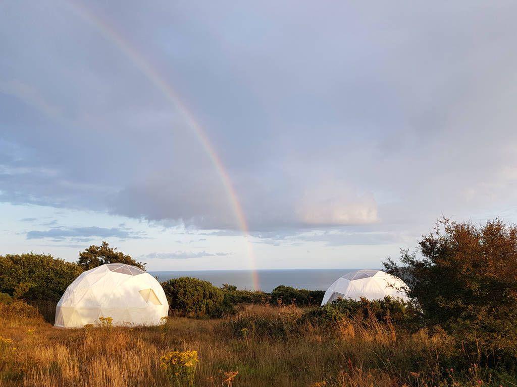 We've got seven geodomes. Six of them we use for accommodation and the seventh one we have for cooking and for doing activities and socialising and stuff like that, so it's a bit of a hub. All our domes look out to sea and they're off-grid apart from water, so solar-powered, two compost loo's... which once people get the hang of and understand the benefits of using (you're not flushing away five litres of water every flush) then people are kind of like yeah, okay, great.