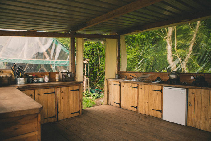 - Private indoor kitchen (equipped with cool box, cooking and eating equipment) with cooking on the wood burner inside or BBQfirepit and rocket stove (on the deck outside)