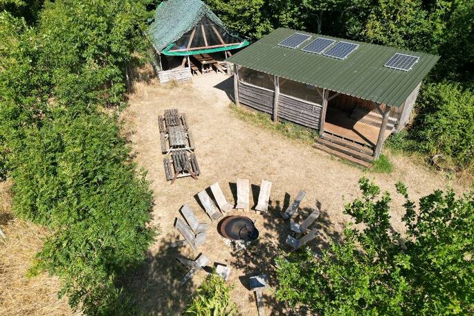 - Shared kitchen with options of gas hob, rocket stoves, a wood-fired pizza oven and open fire for cooking