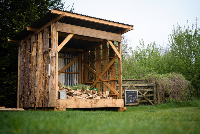 - At the centre of the site, there is a communal kitchen and sheltered area with picnic benches, a hammock and a firepit