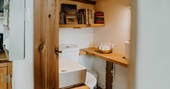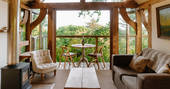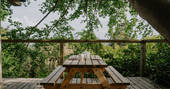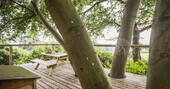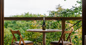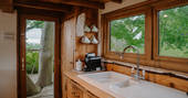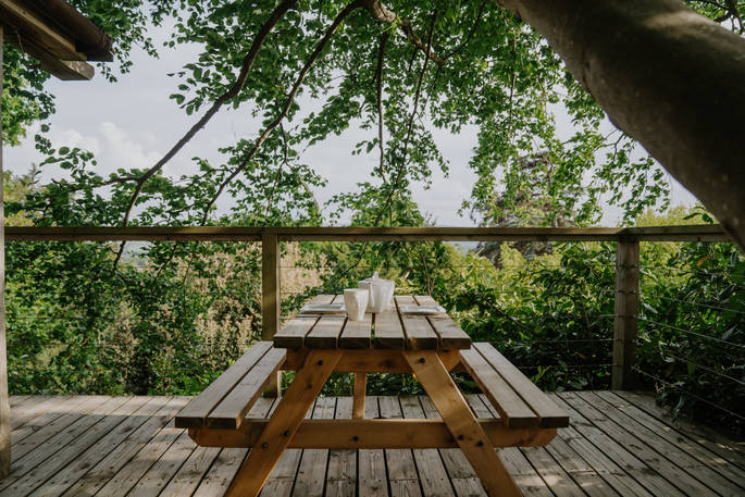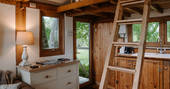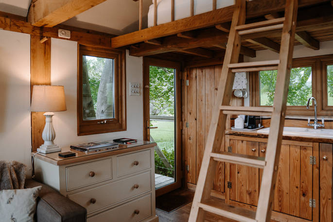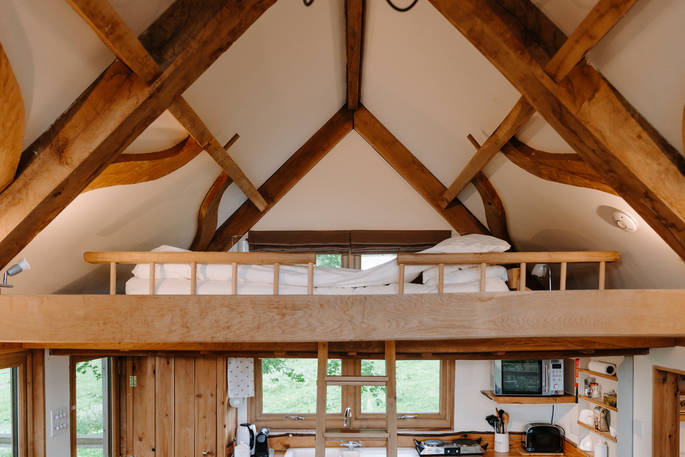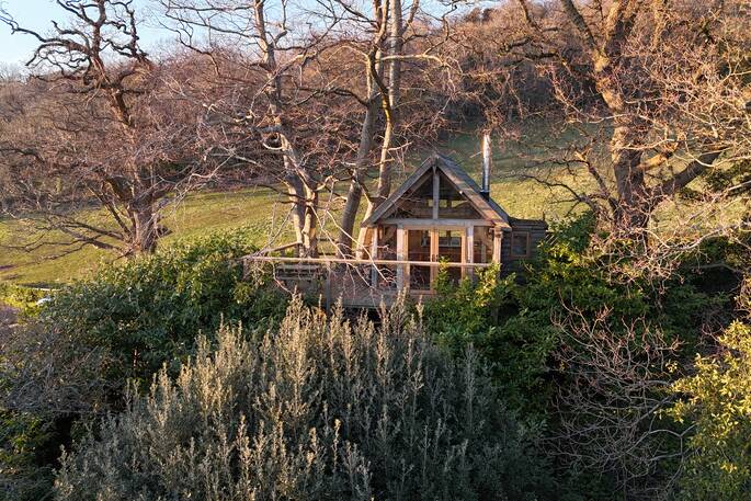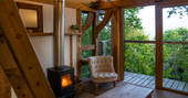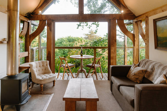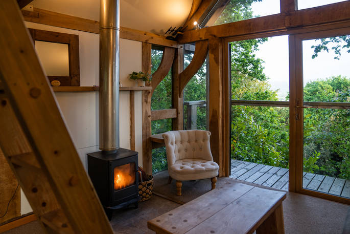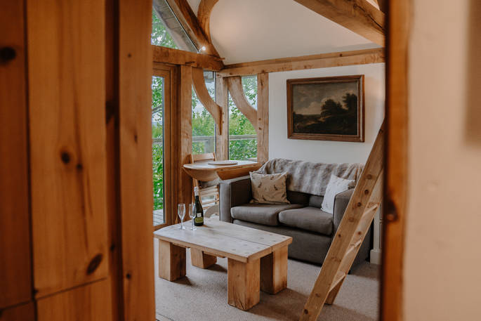 Uplands Treehouse is a beautifully crafted bolthole perched up in the trees behind David and Tricia’s house. Scale the ladder up on to the mezzanine to reach the king-size bed; you’ll wake up in the morning to views over the Mendips on one side, and a number of alpacas and horses munching grass on the other, along with light streaming in through the big floor to ceiling (curtainless!) windows. The coffee table in the main living space is handmade from off-cuts from the treehouse itself; smaller trimmings are from the woodland behind, which is yours to explore – a folder of David’s recommended trails are in the treehouse. The huge balcony with uplighters and picnic table is perfect for a little glass of something on summer evenings; the comfy sofa in front of the wood burner is ideal for the winter ones.