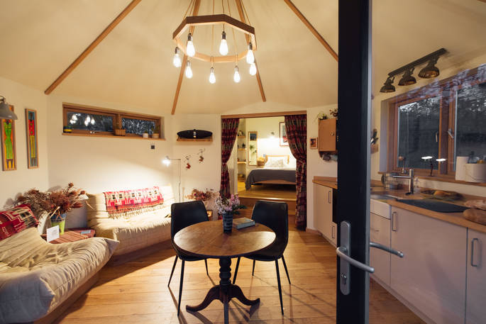 An incredible blend of style, comfort and the great outdoors awaits in this beautiful treehouse hidden in the Cambridgeshire woods with a sauna. Grab a torch at the top of the path and wander down to check yourself into an octagonal masterpiece, flooded with light through the huge windows, surrounded by birdsong and hidden from the world by the woods. The space is open, bright and colourful, framing the stunning views and making nature a real part of your stay. There’s an abundance of birdlife, with owls, woodpeckers, ducks and moorhens all calling the land home, as well as tiny muntjac deer that can be spotted in the woods if you’re quiet. Happenoak has all the mod cons - a fully-equipped kitchen and bathroom - but the standout features are the bathtub, that’s taken a wander out onto the deck, so you can soak under the stars or in front of that endless countryside and the unique elevated sauna.
