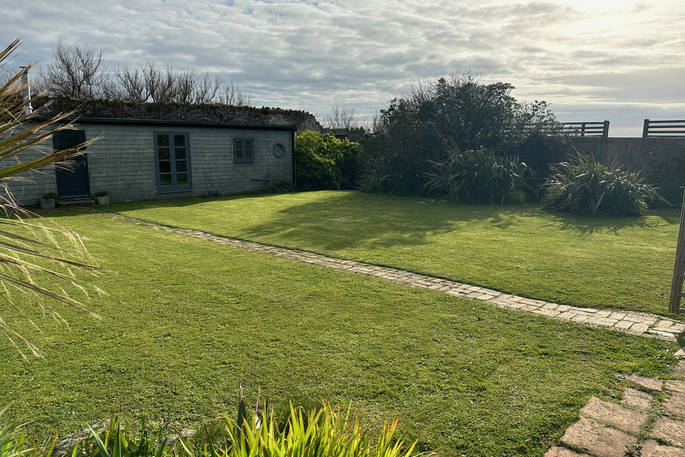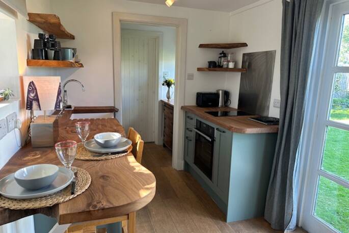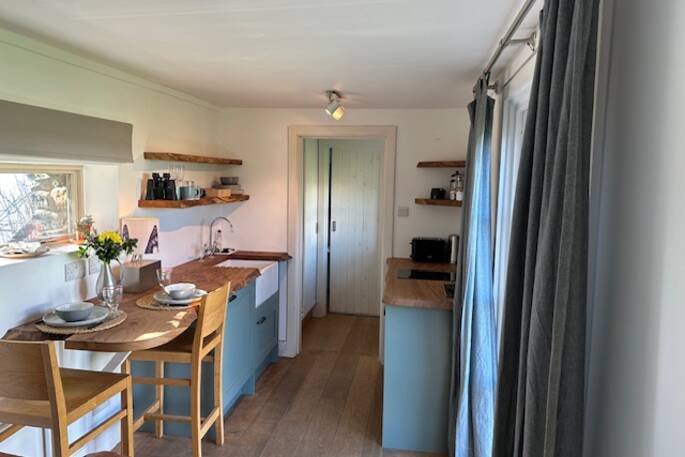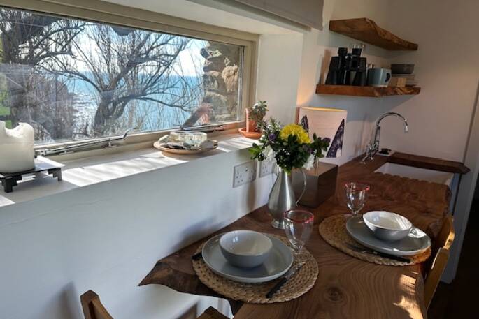 Up the hill from the village, behind Sean & Alex's landmark house (you won’t miss the white crenellations) and across the walled garden, you’ll find your snug, seaside hideaway. An unassuming white shack on the outside, the compact interior has been given a full, contemporary makeover and plenty of little luxuries. There’s a romantic wood burner for the cooler evenings as well as electric radiators throughout, and a mini kitchen with oak breakfast bar and views of the bay. The bathroom has a beautiful double-ended bath and a nautical porthole window that reminds you of your coastal surroundings, although with the faint sound of the waves lapping below as you drift off, you probably won’t have forgotten.