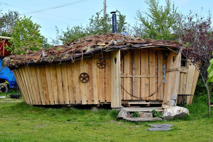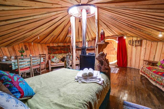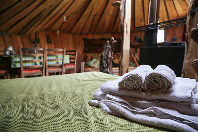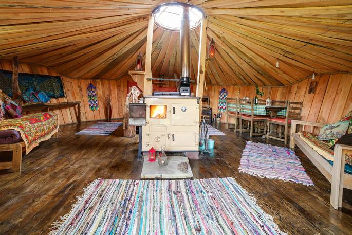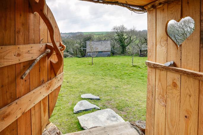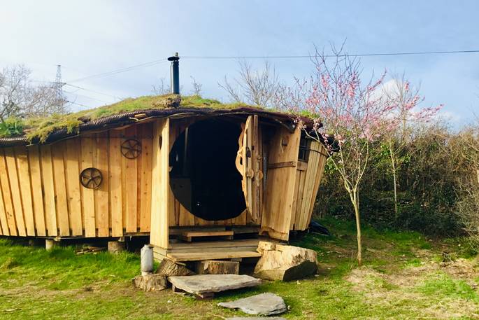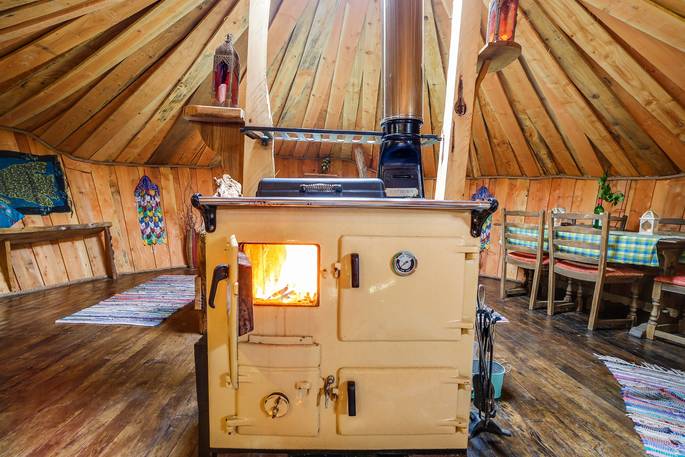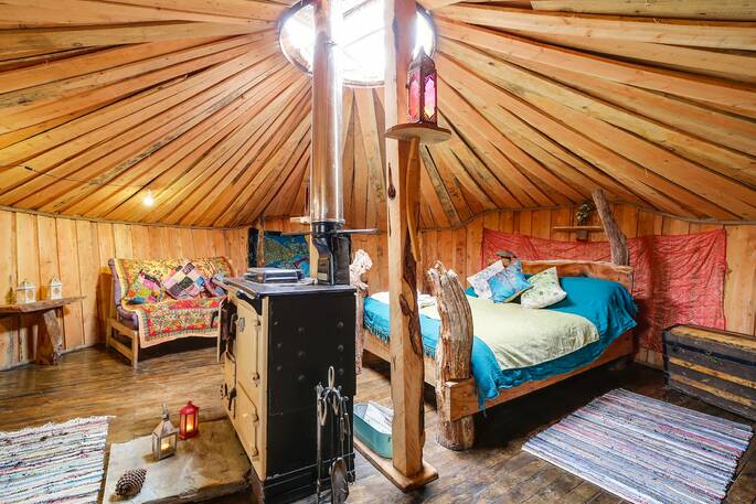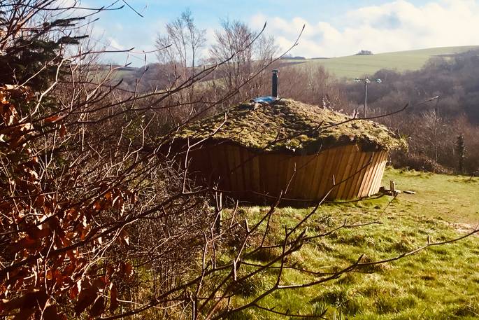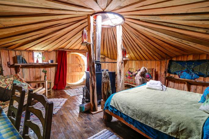 Behind the grass-cloaked roof and round hobbit door, a quirky space awaits. The wooden yurt looks delightfully homemade and appears to have grown up from the land – the labour of love was created using only reclaimed or recycled materials, like elm floors and an oak dining table that seats six. After long yomps on the moors, fold into a big pile of cushions and dry your socks in front of the toasty Rayburn as your pasties warm inside. Up to six can sleep on the bed and fold-out futons; bring a thick duvet for snuggling up together. After dark, stoke the firepit and sizzle sausages on the barbecue as you dine by the light of the candles and stars. Leave your devices in the car and enjoy a digital detox – this is the perfect place to finish a book (or start writing your own). The compost loo is yours, but you might meet other sociable souls down at the bath cabins, where the hot water is wood-fired and the baths are deep for leisurely lounging. It's a rambling, laid back site, with a true festival vibe!