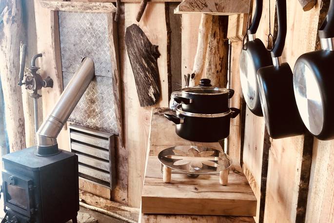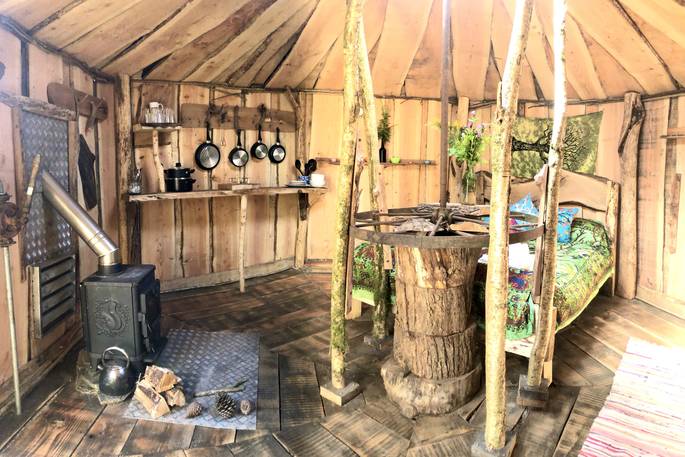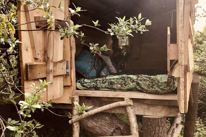 The Magic Mushroom itself is a simple, handcrafted space, constructed entirely from local timber that Lisa and Neil milled themselves and set in its own private garden, about 30 yards from the nearest other space. It has a big double bed, a wood burner, a few bookshelves, candles and an old seed drill that has been reclaimed from the farm. This is a place to take a step back from tech and really let yourself unwind. Just outside the door you’ll find the treehouse, which can serve as the kids bedroom with the roll mats provided or a day space to lounge around in. You have your own private BBQ but the communal kitchen, with plenty of cooking space and a big fridge/freezer, are a couple of minutes away, as are the shared showers and loos. The whole place has a laid-back atmosphere of warmth and friendliness, combining the best of campsites with the best of creative design to make a place that’s, well, magic in it's own quirky way.