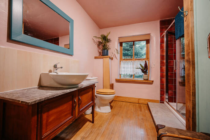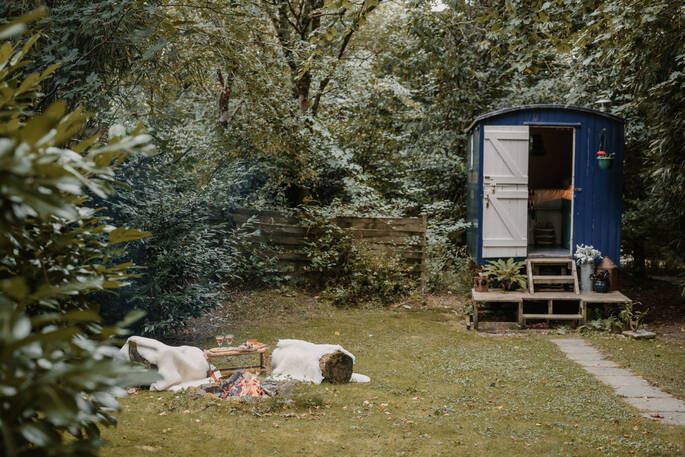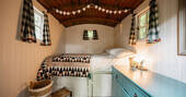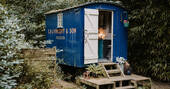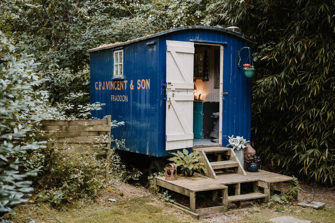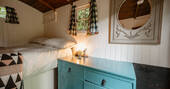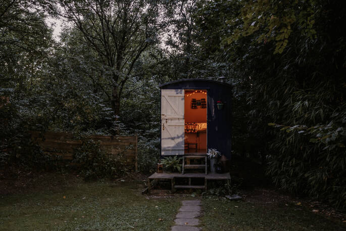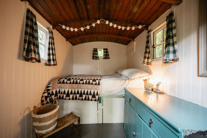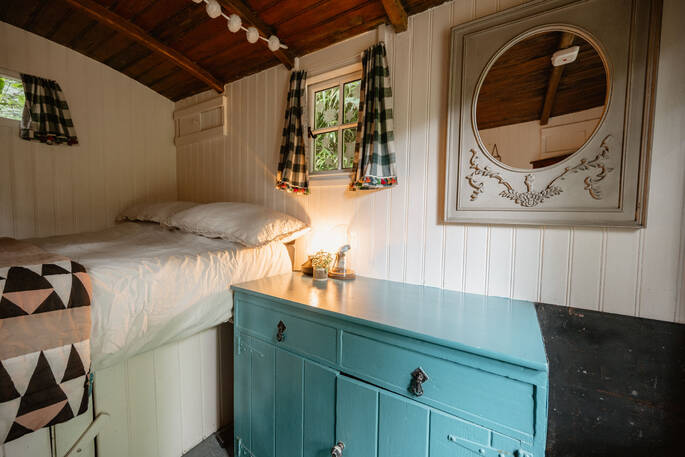 Original blackened floorboards, a curved roof and a tiny, retired tortoise wood burner all take you back to the 1930s, when Pip was actually out on the roads as a steam roller living van. Little windows on each side let in plenty of light, and Kitty and Paddy have been busy filling the place with an eclectic mix of antiques and vintage finds collected over the years (they used to own two vintage boutiques in Falmouth so this is right up their street!). As well as your cosy bedroom, you’ve also got plenty of space to hang out - just across the garden you’ll find Pip’s Cabin, a wooden cabin with a lounge with books and games, a fully-equipped kitchen and a large shower room. And the garden itself is a lovely space to just sit by the fire or in your wood-fired hot tub and look up at the stars. Wander around Spring Park and you may meet your neighbours - from colourful wagons to tin chapels.