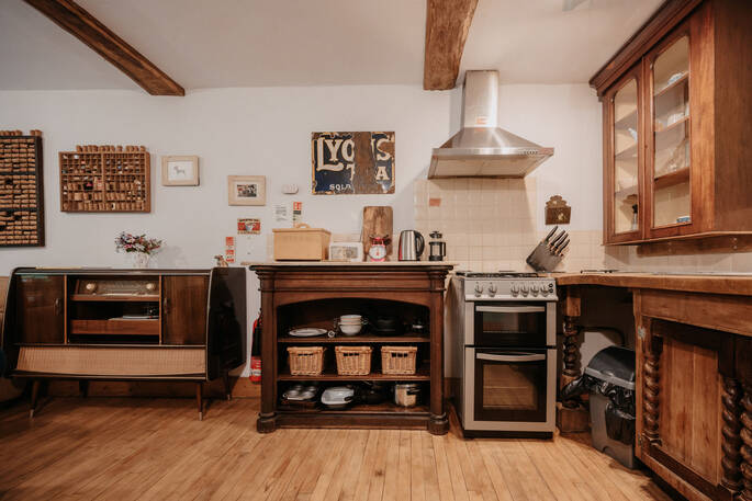 - Kitchen is located in Pip's Cabin and is equipped with a gas cooker, kettle and undercounter fridge