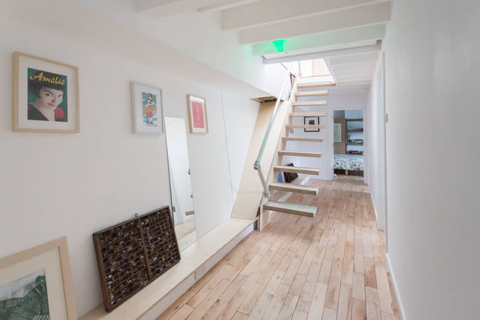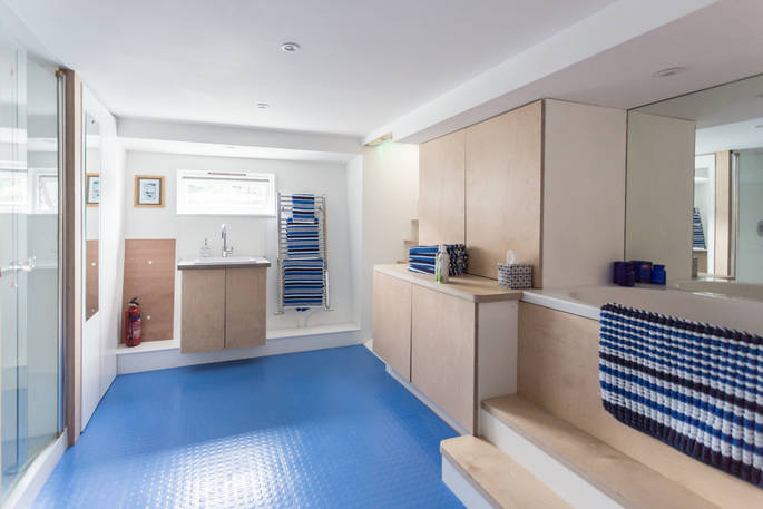 Downstairs, (but still above the waterline!) you’ll find space and comfort for all the family with three cabins and a bathroom (with shower, double ended bath and composting toilet). Robin and Jane, creators of barge The Floathouse Amelie, have put the same enormous amount of care into limiting the impact on the environment as they have into the comfort of their guests. Biomass heating, rain water harvesting, electricity all from renewable sources and reclaimed and local wood are just some of the ways The Floathouse Amelie minimises her impact on the environment.