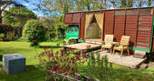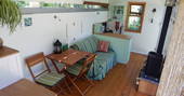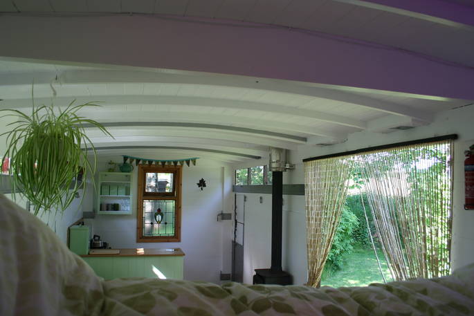 The horsebox can either be a cosy place to cuddle up by the wood burner, or an airy, sunny space: let the side door down on fine days and bring the outdoors in. Across the traditional hay meadow, there's a lovely view to the horizon - a lovely place to watch the sunrise, if you're up and about early!