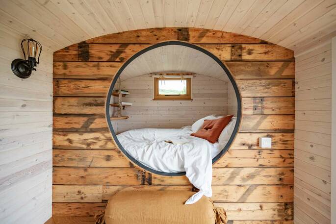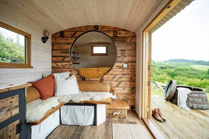 Rescued from the scrap yard, this train carriage has had a makeover, with a bespoke fitting of reclaimed wood creating an entirely new vibe inside, that spills out to a fresh deck complete with throws and pillows to lazily watch the world go by.