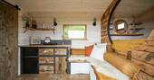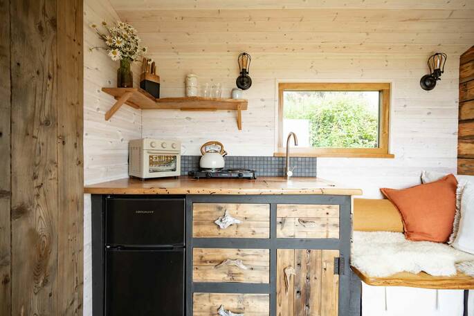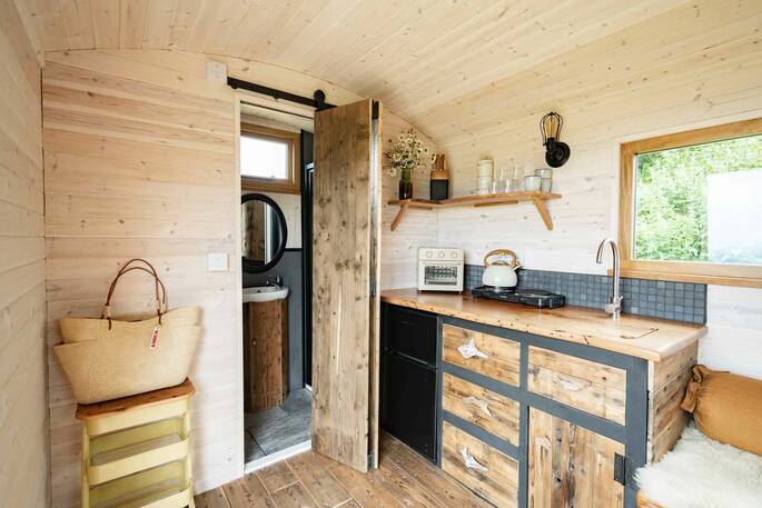 Such an idyllic spot. Luckily the rain clouds parted in time for a beautiful sunset whilst soaking in the barrel hot tub. The old carriage is warm, cozy and beautifully made over.