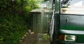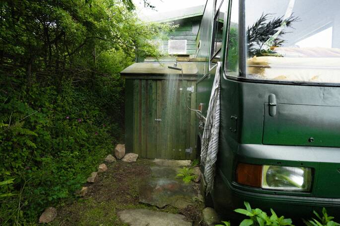 There’s an outdoor shower here, tucked away behind the bus, and you can use that to start the day invigorated or go even more au natural and take your outdoor shower the old-fashioned way, under St Nectan’s Waterfall across fields, the woods and a stream. There’s even a wood-fired hot tub for day’s end. You’re not far from other spaces on site, there is a walking path alongside the bus, and you could very well bump into the owners, if you’re strolling their 44 acres – but everything’s set up to give you all the privacy you’d want, and you’ll likely be too thrilled at your space to even notice.