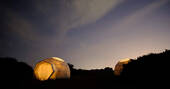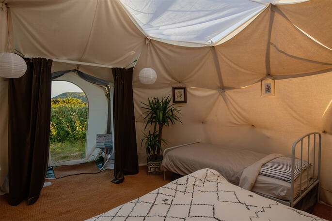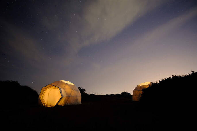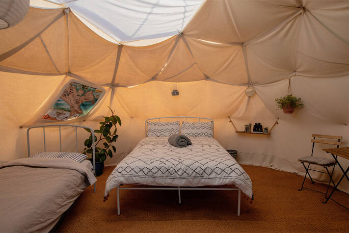 Each of the domes has a double bed, with two extra single beds available for kids, and is a simple space built for relaxation after a day of adventuring in Cornwall. The six domes share two showers and two toilets creatively housed in a trailer, but you’re more than welcome to pop over to the neighbouring campsite and use the facilities there. A seventh dome is used as a communal space, with basic cooking facilities if the local pub or The Canteen don’t tempt you out for dinner. The whole site is natural and off-grid, but lanterns are provided so you can get around and the lack of power just adds to the feeling of simple, rustic goodness and a friendly spirit that’s at its best on the frequent pizza and music nights.