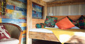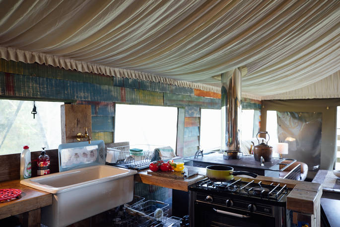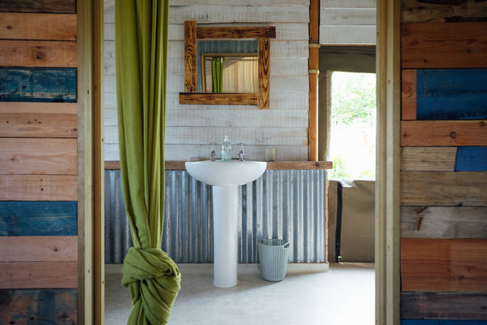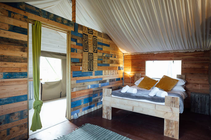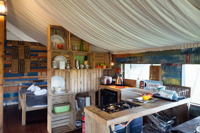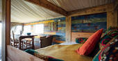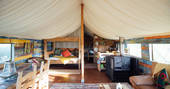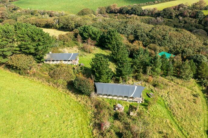 At the end of a track through the fields of coastal Cornwall lie Twiga and Tembo, two safari tents in an island of peace. Both tents are fully insulated, making them comfortable all year round and perfect for cosying up on a winters day. Just in front of the tents a brook winds through thick woodland where deer, badgers and foxes can be heard and even seen if you sit quietly. There's a main double bedroom with en suite flushing loo and hot shower room, and a double day bed in the living area where the wood-burner glows at the centre. Enjoy the space of the tent just the two of you, or head out onto the deck for BBQ meals and board games. After a day's exploring there's also a hot tub for two just outside to come back and soak in.