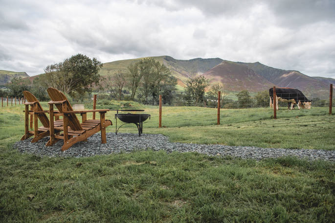 As well as being a great source of local knowledge, Luke is also the creator of the space you’re staying in and the other cabins that share the field, but are positioned for privacy. The Stag is constructed to his own design using almost entirely local materials. Most of the wood comes from a sustainable sawmill a mile away, the slate from Honister and there’s a douglas fir tree stump from up the valley holding up the bathroom sink. Even the coffee was locally roasted and the vintage tractor seats at the breakfast bar haven’t travelled far. You’ll find the king-sized bed wonderfully comfortable, the hobbit stove in the corner backed up by underfloor heating, the kitchen equipped with kettle, toaster and gas hobs and the en suite bathroom all modern and excellently finished. Outside, the wood-fired bath makes a perfect spot for lying back and looking at the hills you’ve been walking through or, with the light pollution so minimal, the glorious night skies.