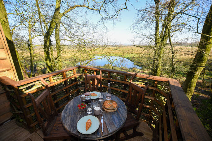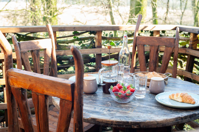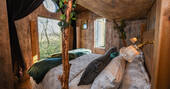 The magic begins the minute you step onto the gravel path, meandering its way through private woodland in search for the treehouse hidden within its midst. Once found, climb up and disappear into the land of the Faraway Treehouse. A treehouse with an eclectic, timeless interior, lovingly designed, perhaps by pixies themselves! Velvet curtains frame floor-to-ceiling windows with such views that you don’t even have to get up to enjoy the sights and sounds of the trees around you. The double ended roll top bath sits beneath a large picture window perfect for a lazy, scenic soak. Morning coffee can be whipped up on the gas hob, and you can try the grill on the chimenea to add a smoky flavour to your breakfast. The balcony outside is a branch-woven, nest like spot perched high above the pond. A perfect place to watch the resident deer or to stargaze at night, picking out the face of the moon. Later you can move inside, light the wood burner, and cuddle up on the sofa. If the kids are with you, they can scramble up into the bunk above the main bed, hopefully exhausted from a day of den building, fun down at the river, or wildlife spotting in the woods.