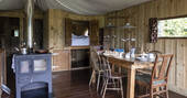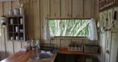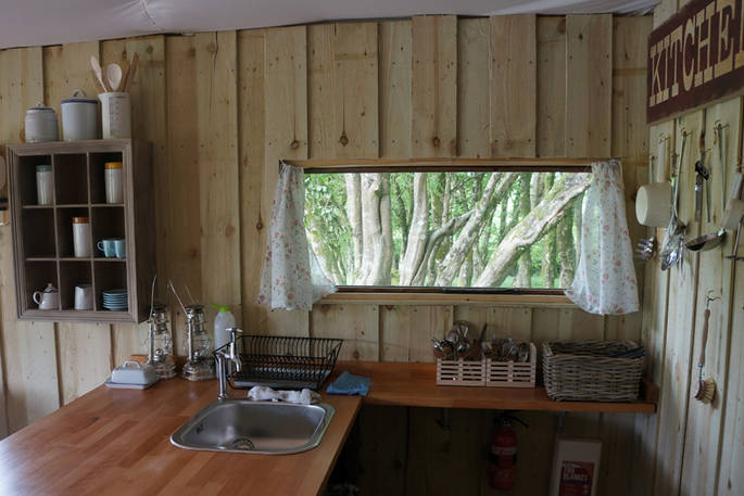 Hartland Cabin sleeps up to six and has a vintage charm but with the comforts of home. The cabin is made up of a double bedroom with shower room through a mini door, a bunk room and a cabin bed. The kitchen has cold running water and each cabin has a proper flushing loo.