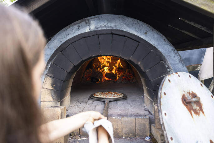 Make a pizza and cook it in the wood burning pizza oven which is lit Mondays and Fridays for guests to cook their own pizza on, either to eat outside by the oven, in the dining barn or wander back to your cabin.