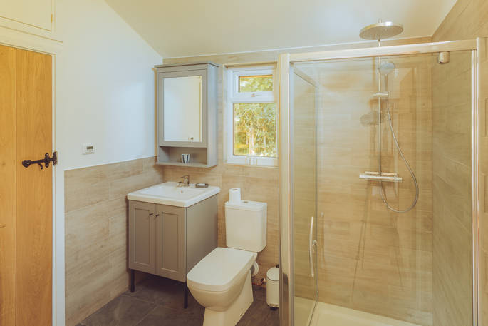 As settings go, it’s hard to deny, Mayfly Cabin has one of the best. Encircled by lofty hills, billowing tree canopies, aside a five-acre lake bedazzled and fringed with emerald life – just a glance from a window or the French doors is enough to refresh and rejuvenate. Outside said French doors, are the patio, where the serene landscape will tempt you out for every meal, cuppa, or spare moment – and if you brought your fishing rod, you can choose between feeding the trout, or the trout feeding you. The site is a working trout farm, so fresh fish is very much on the menu – you can get fresh or smoked trout, as well as smoked salmon (consider bringing a large stack of bagels and cream cheese). Inside the cabin there’s a modern kitchen, to whip food together either for inside or al fresco. Nearby, the kitchen area gives way to the living space, which you’ll likely make use of on rainy days, with books and board games or the evening, when the sun drops behind the hill range and it becomes log-burner-o’clock. Brighter days will tempt you outdoors, to explore the sights of the estate (off limits areas are marked), or only slightly further afield to the many beaches just a short drive away: Woolacombe, Morthoe, Ilfracombe and many more. You’re in between several AONBs at Mayfly Cabin, so whether you’re looking for adventure on surf, or on turf, you’re in the best place you could be.