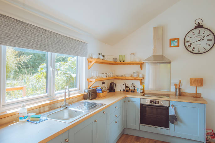 - Kitchen equipped with an oven, electric hob, kettle, toaster and an undercounter electric fridge freezer
