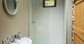 - Bathroom with a large walk-in shower, sink and flushing toilet