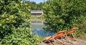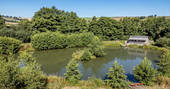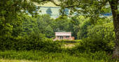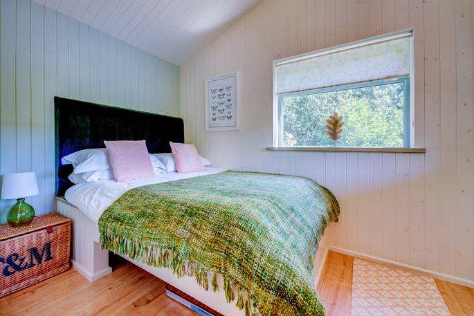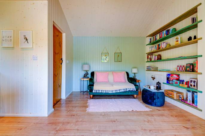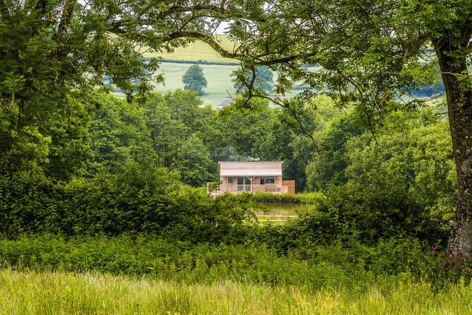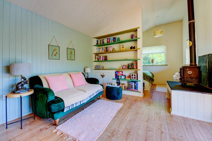 The moment Gosling Lodge comes into view as you round the corner of the gravel track, you start to relax. A pocket of trees screen the cabin and its pond from view, leaving you alone with the meadow and the hills beyond crossed only by a distant, quiet road. Handcrafted by a local carpenter, Gosling Lodge is an open space of simple comfort with splashes of blues and green echoing the water outside, where the eponymous birds are often seen in season. Lounging on the veranda or the sofa by the wood-burner, you sink into a dreamlike state of ease. On sunny days, you can splash around in the boat, but even in chillier weather, the covered porch and the cosy cabin itself are lovely spots to curl up and and let the day drift by.