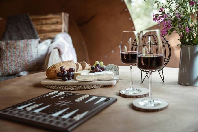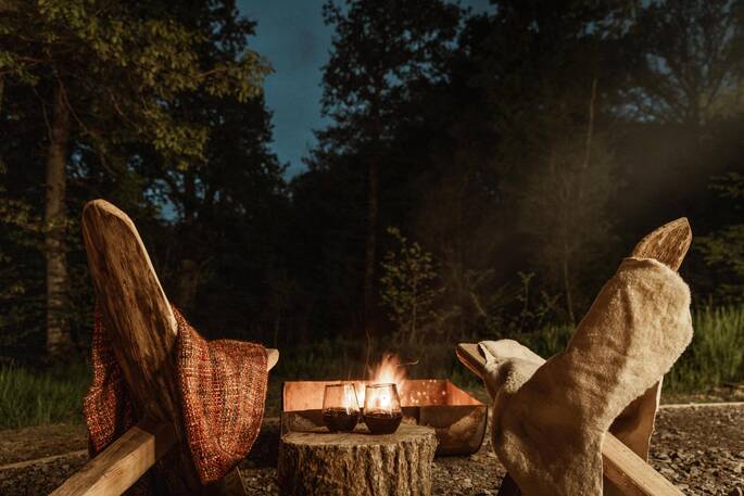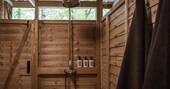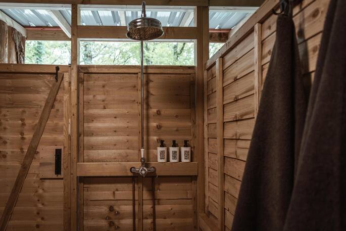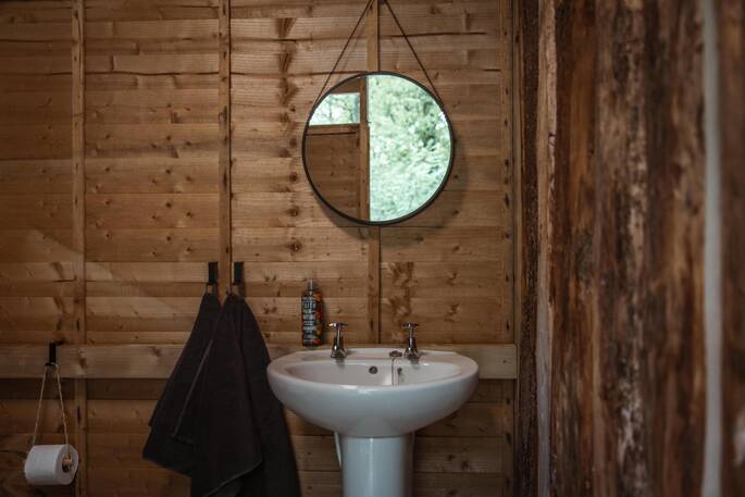 If you’re eating in, you’ve got a couple of options - the gas hob (easy, but a little boring) the Aquaforno cooking system (a cool combination of bbq and pizza oven) or the fire pit (a chance for the wilder folk to get their flame on). There’s space outside to dine on and a table with big armchairs inside, where you’ll also find the big double bed and the woodburner. A minute or two through the trees brings you to the shower block, where every Truffle has its own dedicated space, so you can leave your things for the duration of your stay. You’ll probably meet other guests here, so you can socialise if you like, but Heartwood’s little spot in the woods is just for you. You can end the day in the glow of the fire listening out for owls and generally not thinking about much at all.