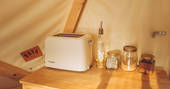 - Kitchen equipped with an electric hob, fridge, toaster and kettle