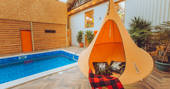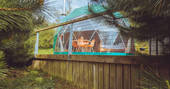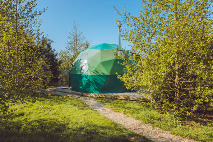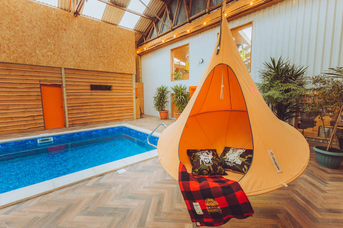 A couple of wooden huts sit on your elevated deck – one has the kitchenette inside, the other has a hot shower and eco loo. The pod has a wood burner for keeping cosy but is still made of canvas, so those staying in winter will want to pack plenty of warm clothing. As if that wasn't enough, Loveland Farm also has an 11 metre, indoor heated saltwater swimming pool, heated by a woodchip-fired biomass.