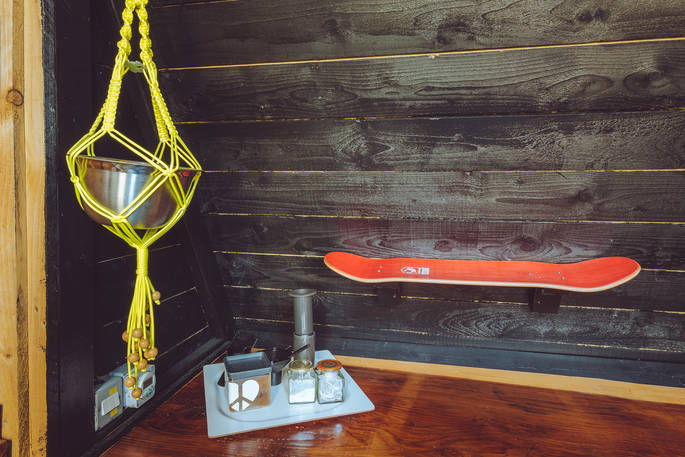 The original Loveland Pod was dreamt up after Karina and Jeff travelled the world with their fashion line and the touches of luxe carry on in the eight new pods, with shiny copper rain showers, ghost chairs, and cashmere blankets.