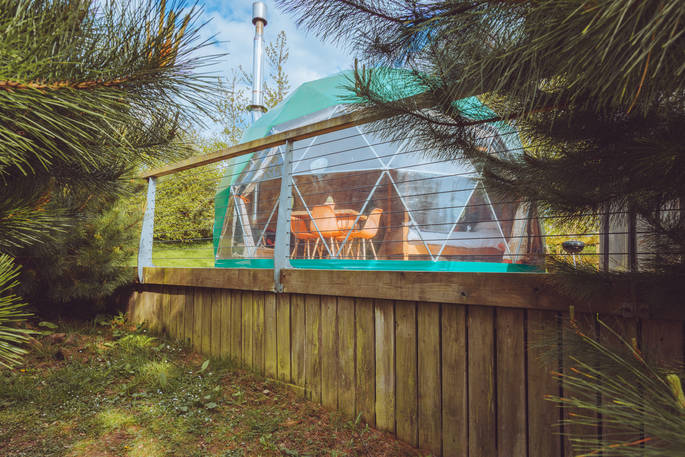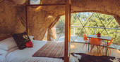 Welcombe Pod is a super strong stainless-steel skeleton covered in a lightweight shell, with enough space inside to swallow up to four people and your dog, if you'd like! Beneath the bubble, there’s a double bed, a sofa bed and a dining table overlooking other green and white pods nestled in amongst the wildlife.