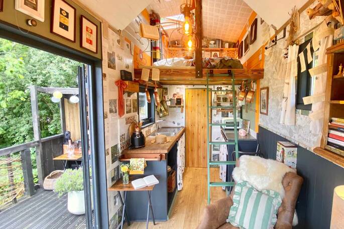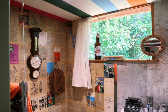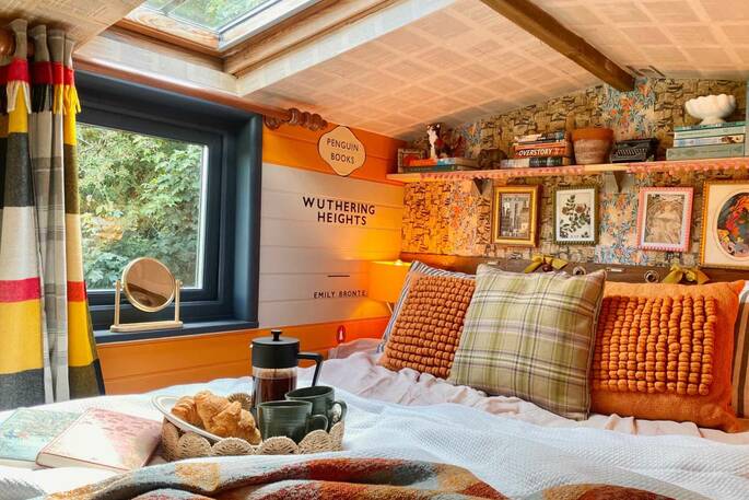 Inside, it’s a kaleidoscope of fantasy and colour – with quotes and references dispersed throughout. Above the modest kitchen, you’ll find the mezzanine sleeping nook, adorned with penguin classic wallpaper, and a skylight to catch glimpses of starry skies.