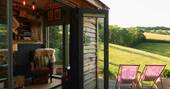 Outside, loungers and a sheltered sofa are ready for sunny afternoons, an al fresco table under a parasol for mid-summer lunches, and a firepit ready to send sparks skyward once the sun goes down.