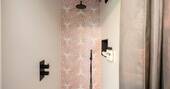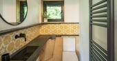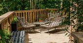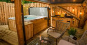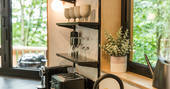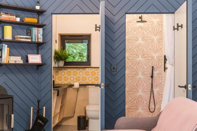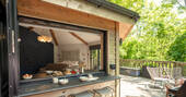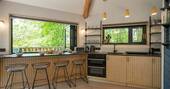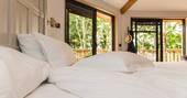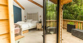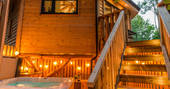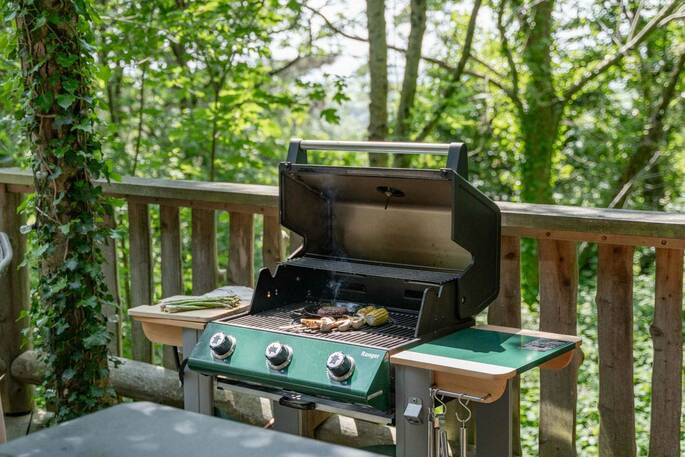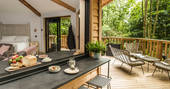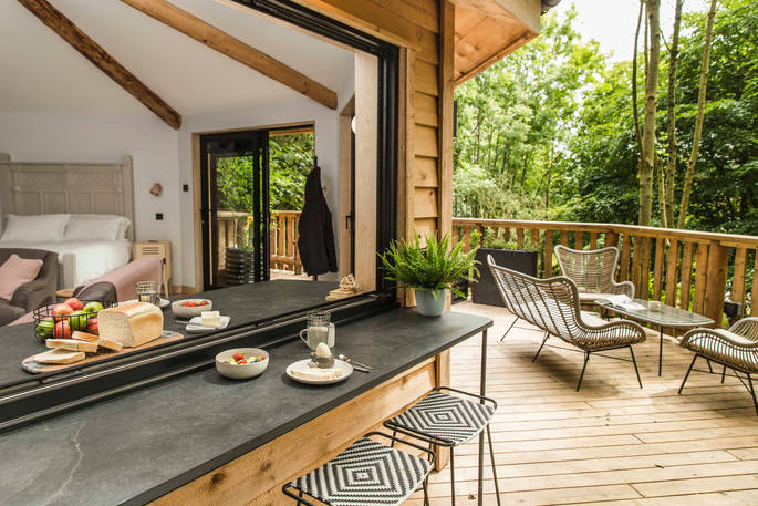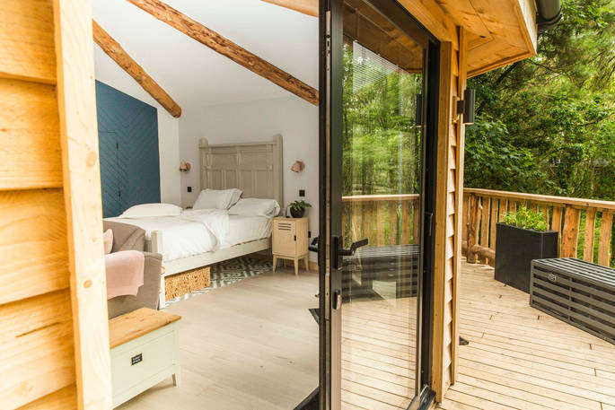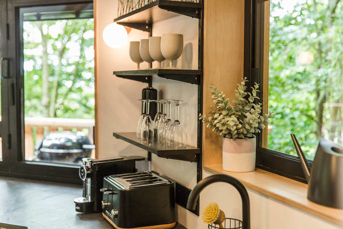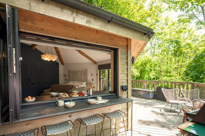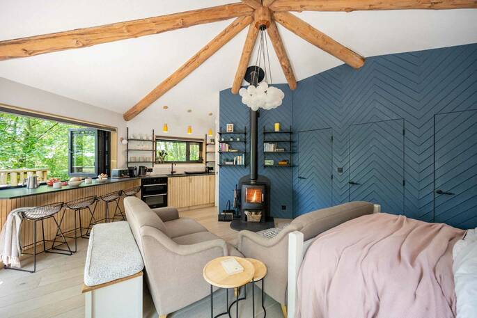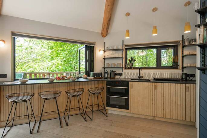 The Den is an island of beautiful design, floating in the treetops next to sister space The Hideaway Treehouse. In the daytime, throw open the doors and the breakfast bar window, sit out on the deck and live surrounded by nature. When the night draws in, close it all up and let the wood burner and underfloor heating turn the lounge into a cosy space for napping, reading or board games. There’s a four-person Jacuzzi on decked space at the lower level, as well as a barrel sauna, and sauna cold splash bucket, for the ultimate spa experience. Cooking options are equally versatile, with a BBQ outdoors and kitchen inside.