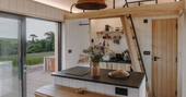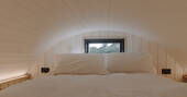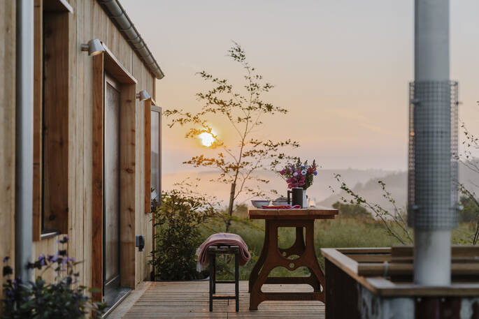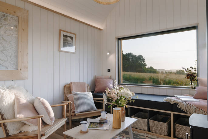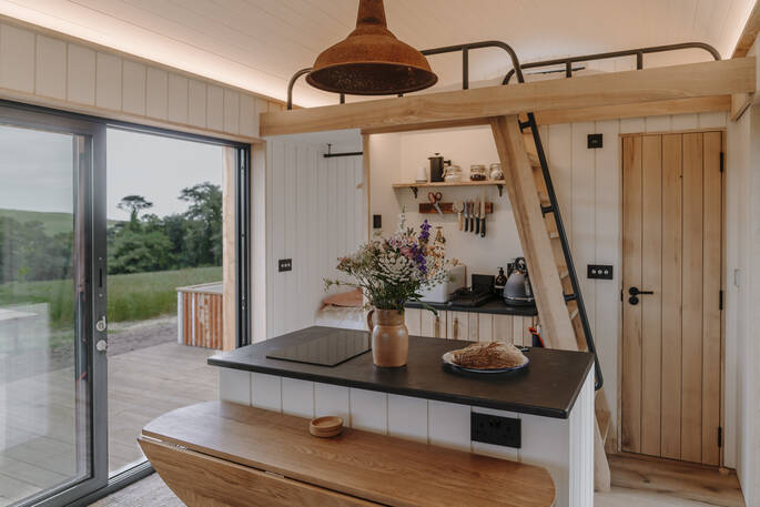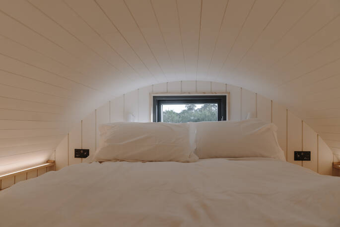 Back at your cabin, you’re as spoiled by location as you are by design. It’s incredibly well made, with the indoors offering a giant picture window to recline with a book by. There’s a spot to sip coffee by the woodburner, an indoor shower, a kitchenette complete with an island counter – and of course, your boudoir. Move seamlessly from indoors to out, with the large Velux windows pouring in light, and the French doors leading to a picnic table outside. That’s also where you’ll find your outdoor shower, the wood-fired bath – and if you venture down towards the trees, shaded hammocks will be waiting for you, swaying in the breeze.